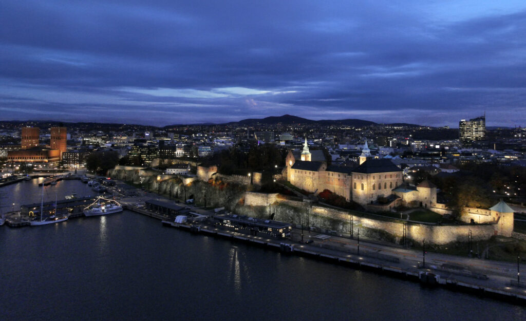 Night view of Klosterenga Park in Oslo, featuring illuminated water cascades flowing through stone structures. The park's serene lighting highlights the natural elements, with the soft glow from beneath the waterfalls complementing the urban surroundings and creating a tranquil ambiance. Trees and pathways are dimly lit in the background, blending art, nature, and lighting design seamlessly.